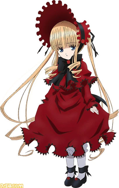 Shinku has light, blonde hair, kept in two twin tails tied at the back of her head, and blue eyes. She wears a red gown with a matching shawl and bonnet as accessories. Her bonnet is fastened with a black ribbon, which is tied into a bow at her neck and held in place with a red rose brooch.